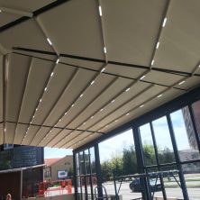 Hareketli tavan örtü malzemesi Alman Mehler marka İspanyol Loncar ve PVC esaslı, 800gr/m2 gramajlı, üç katmandan oluşan block out (ışık geçirmeme) özelliklidir. Ayrıca su geçirmeme, alev yürütmeme özelliğine sahiptir. Standart olarak Krem ve Beyaz renklerde üretilmektedir.